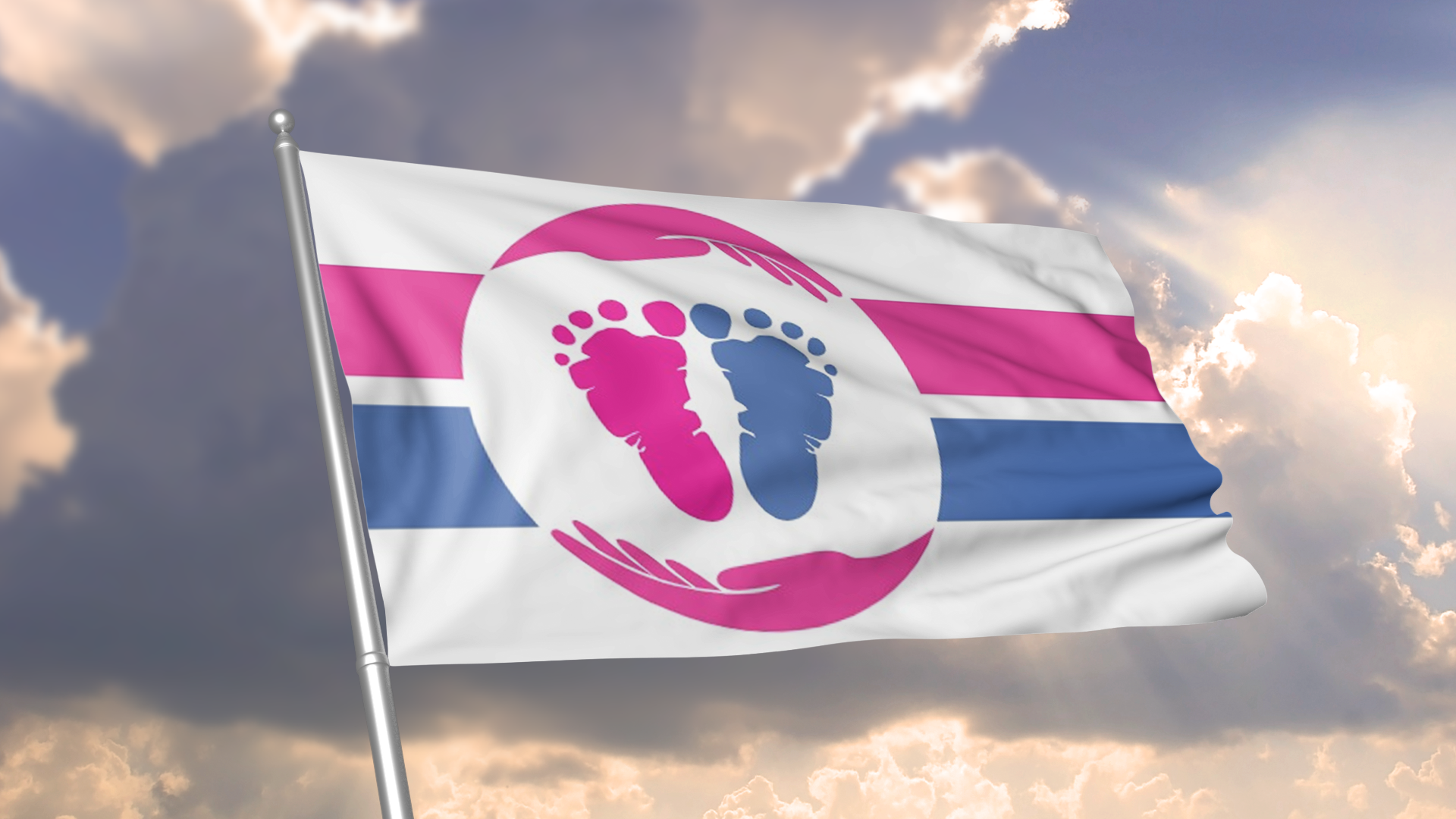 The Pro-Life Flag is highly symbolic of both unborn children and their mothers. Depicting two feet (representing the child), two hands (representing the mother), two stripes, and two main colors, it emphasizes the TWO lives present in a pregnancy and the love that the pro-life movement shows to both. Read more about the flag’s symbolism here.
